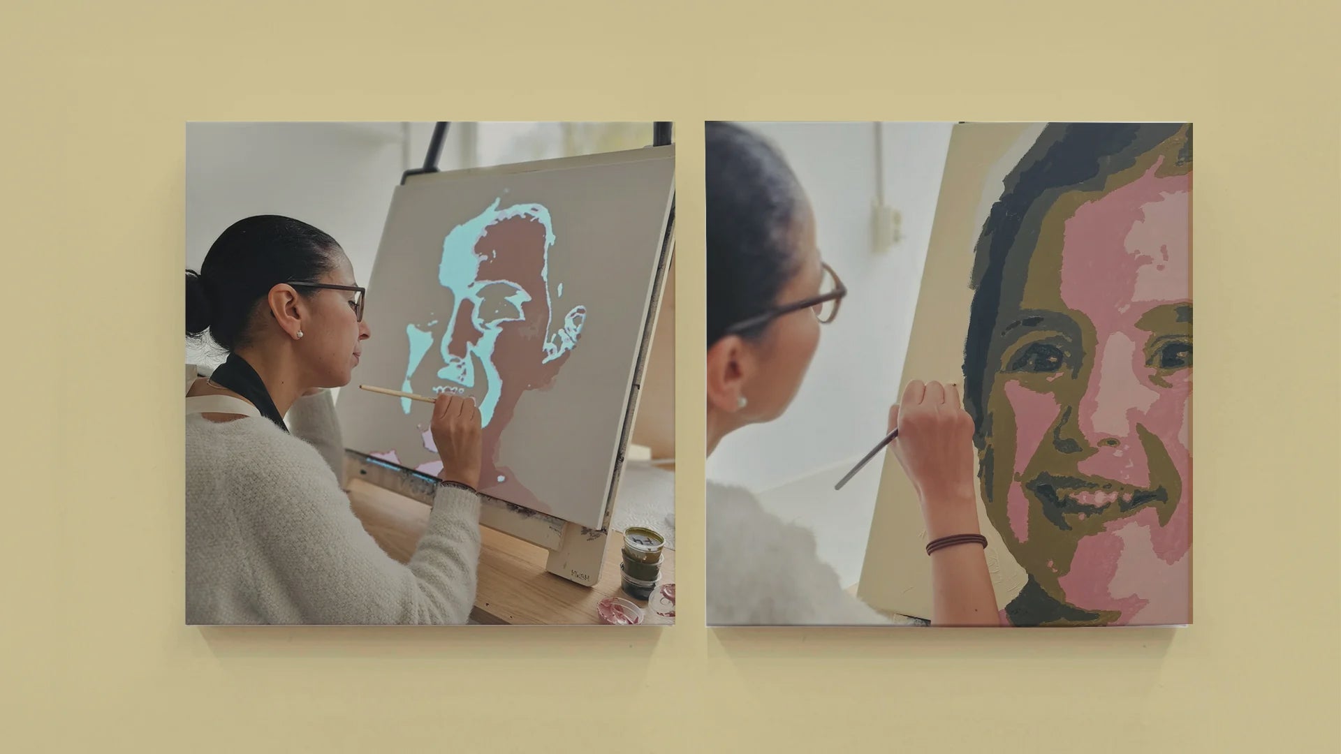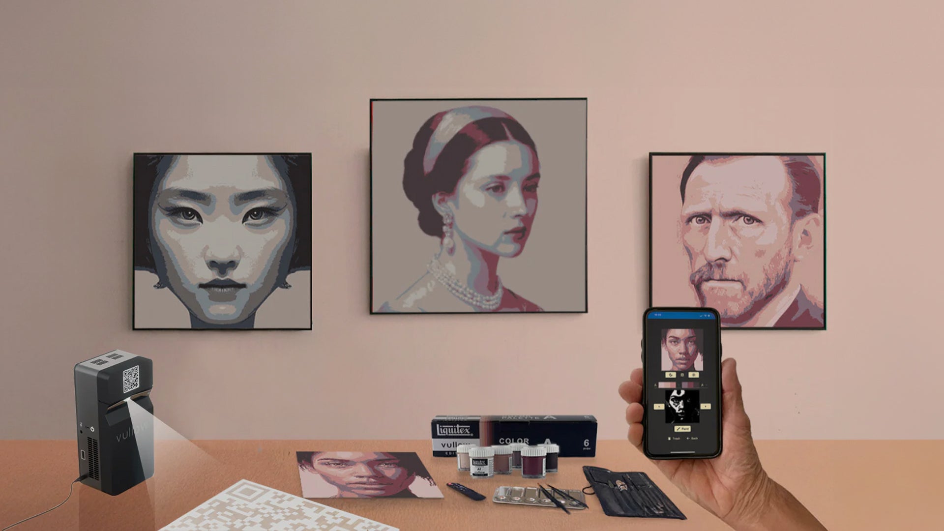 The Vullow painting technique uses advanced light projection to help you create your artwork. By projecting a photo onto your canvas, the contours and shadows are clearly displayed. Get your Vullow case now and get started.